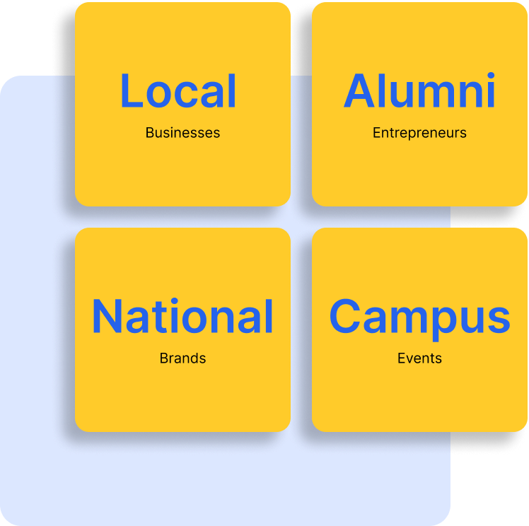 Partner with local businesses, alumni entrepreneurs, and national brands to create a sustainable revenue stream for your institution.